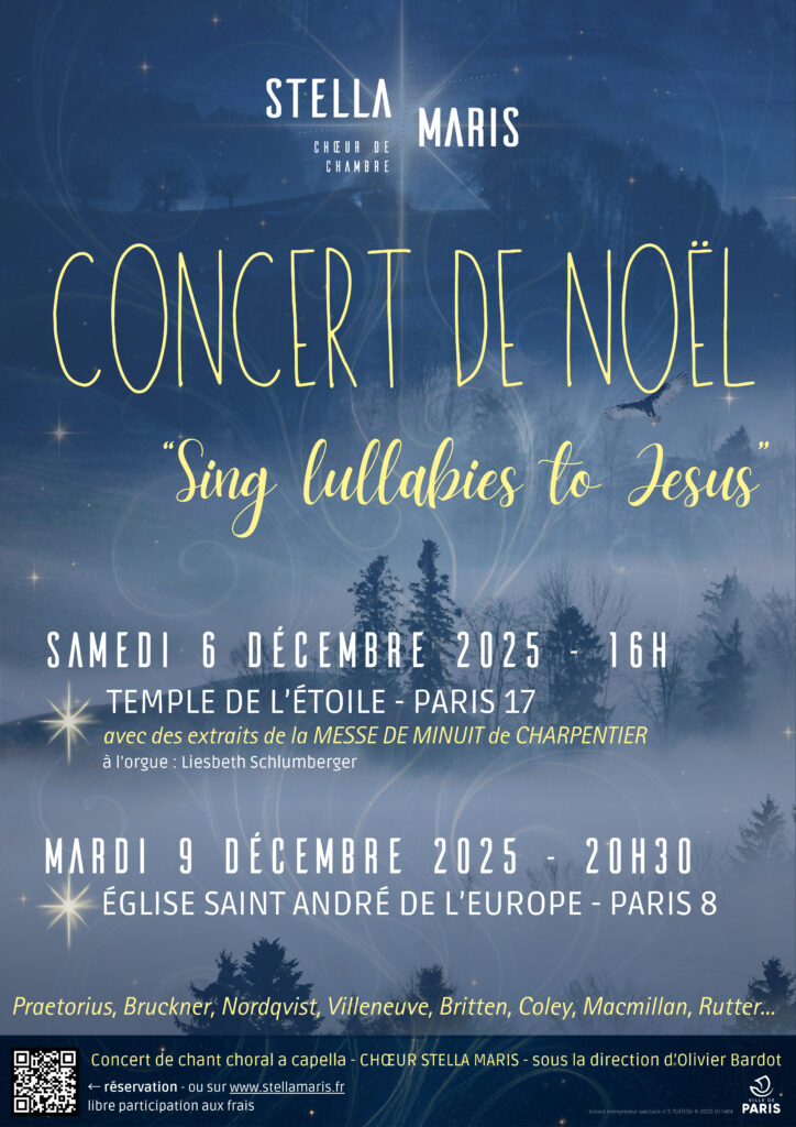« A l’approche de Noël, le chœur Stella Maris vous propose un concert « Sing lullabies to Jesus », mêlant joyeux arrangements, œuvres connues et petits bijoux plus confidentiels du XVIe siècle à nos jours. Un moment convivial a capella vous attend le mardi 9 décembre à 20h30 à St André ».
