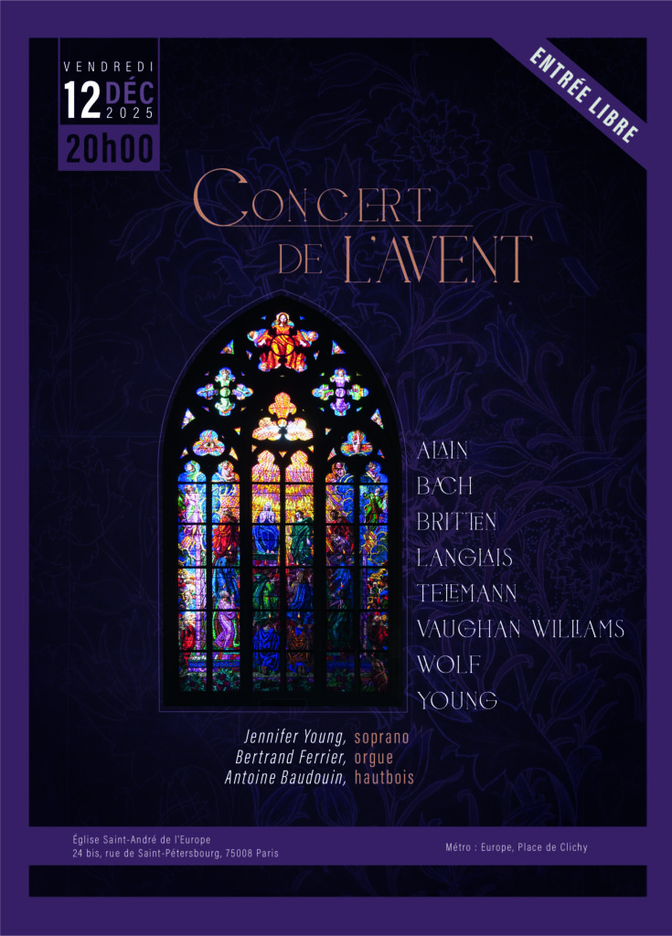 « Pour cheminer dans l’Avent, la paroisse vous invite à un concert intime où la musique de la Renaissance rencontre les répertoires romantique et contemporain. Soprano, hautbois et orgue se mélangent pour jouer Bach, Alain, Langlais, Vaughan Williams et Young. Un récital revigorant et spirituel d’environ 1 h, à ne rater sous aucun prétexte, qui moins est pécuniaire : l’entrée est libre, la sortie aussi, mais ce moment s’annonce intensément bien quand même. »